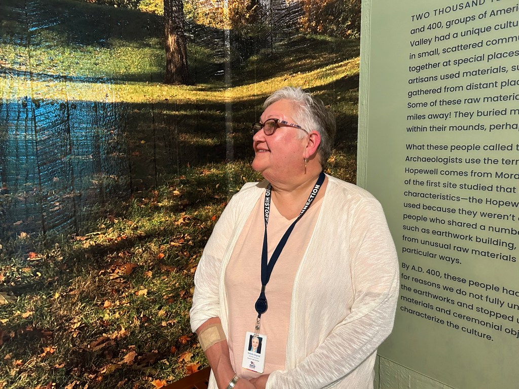 Nekole Alligood in an exhibit about the Newark Earthworks that she helped to develop at the Ohio History Connection. The exhibit prioritizes photos and diagrams instead of displaying actual cultural objects. Credit: Emma Baum